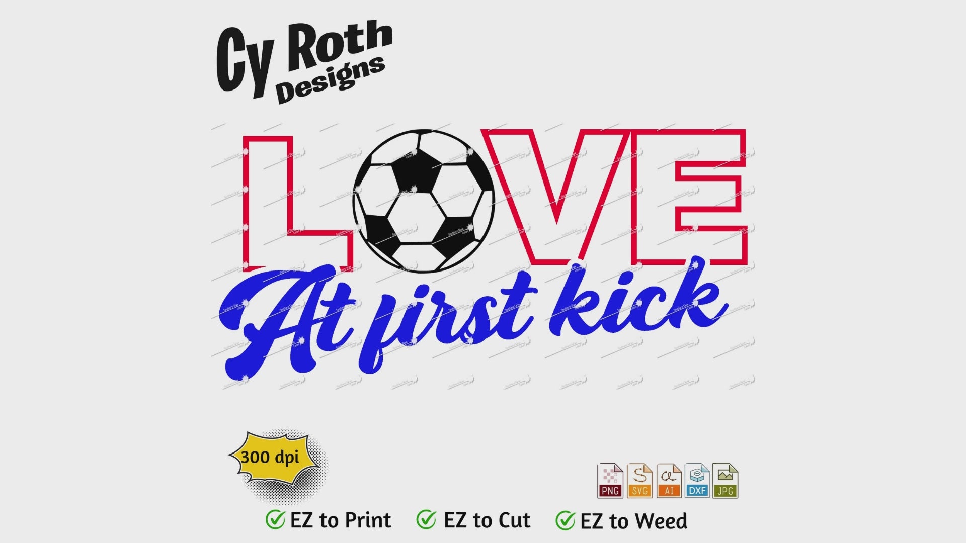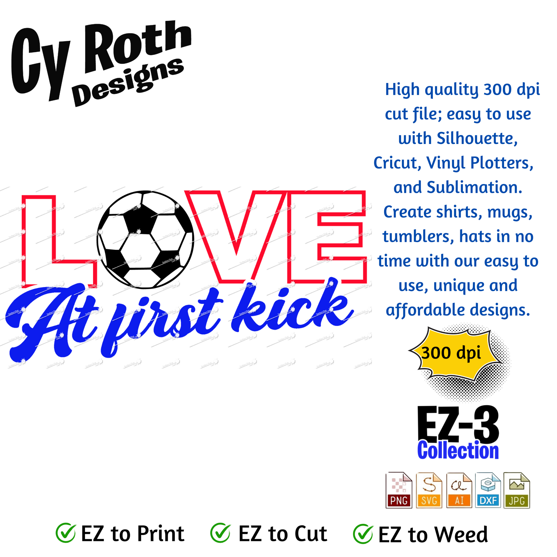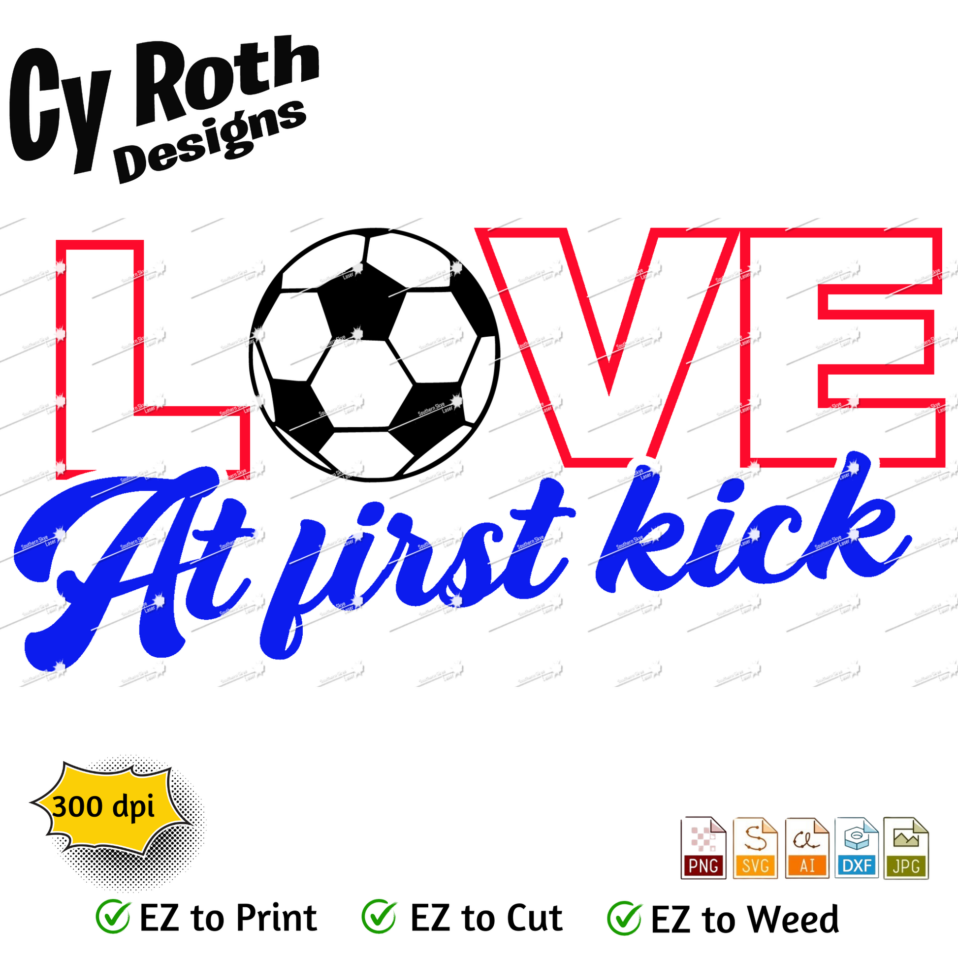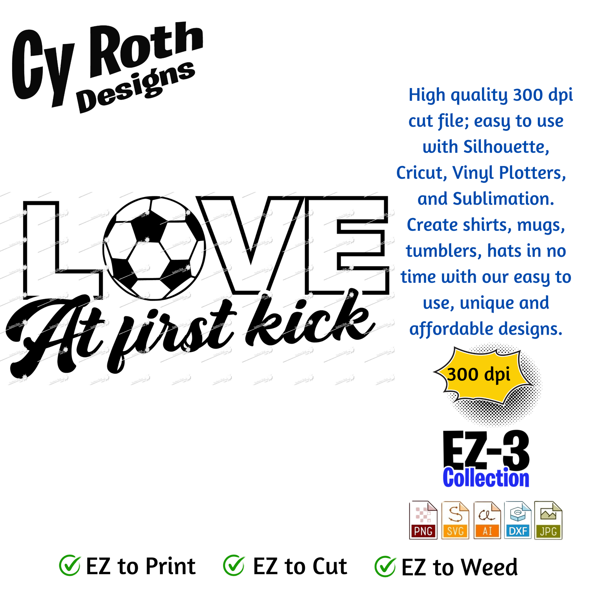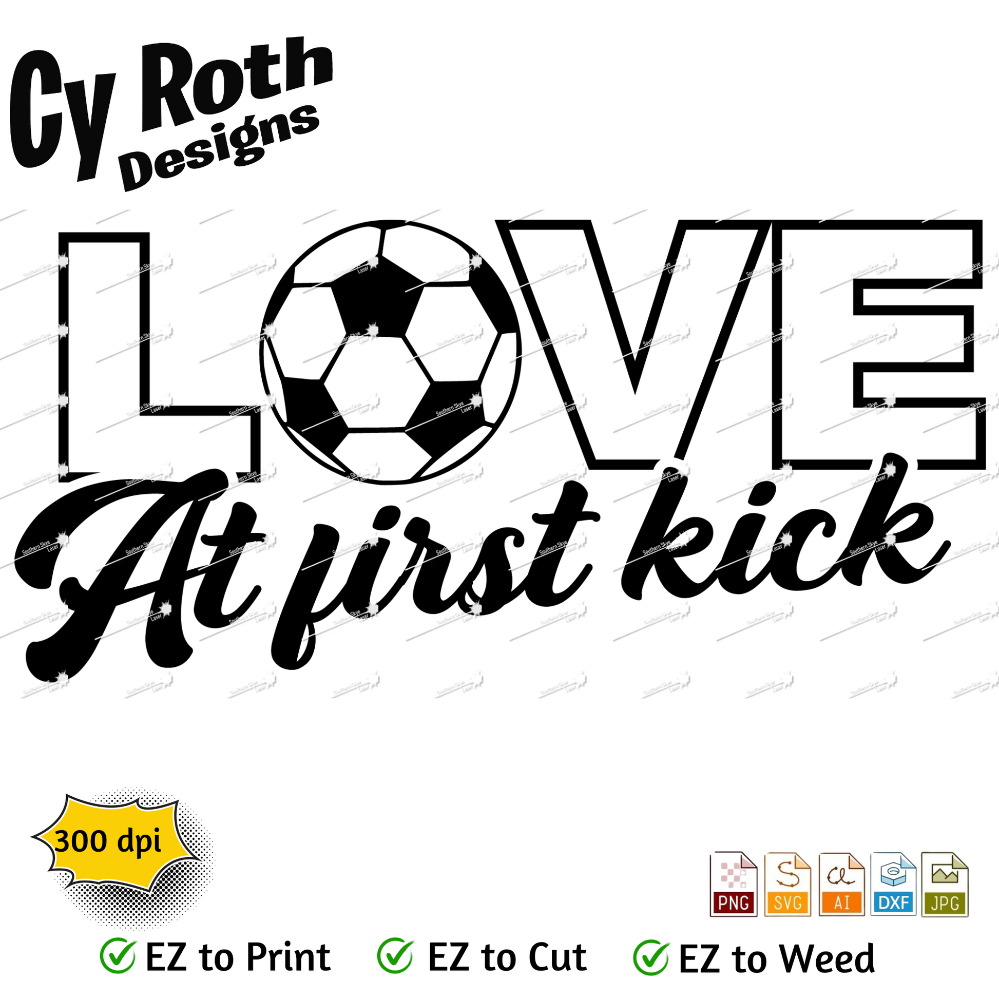 Soccer svg png jpg ai dxf file, for Silhouette, Cricut, Vinyl Plotters, Laser, CNC and Sublimation. Great for DTF and DTG. Love at first kick.
