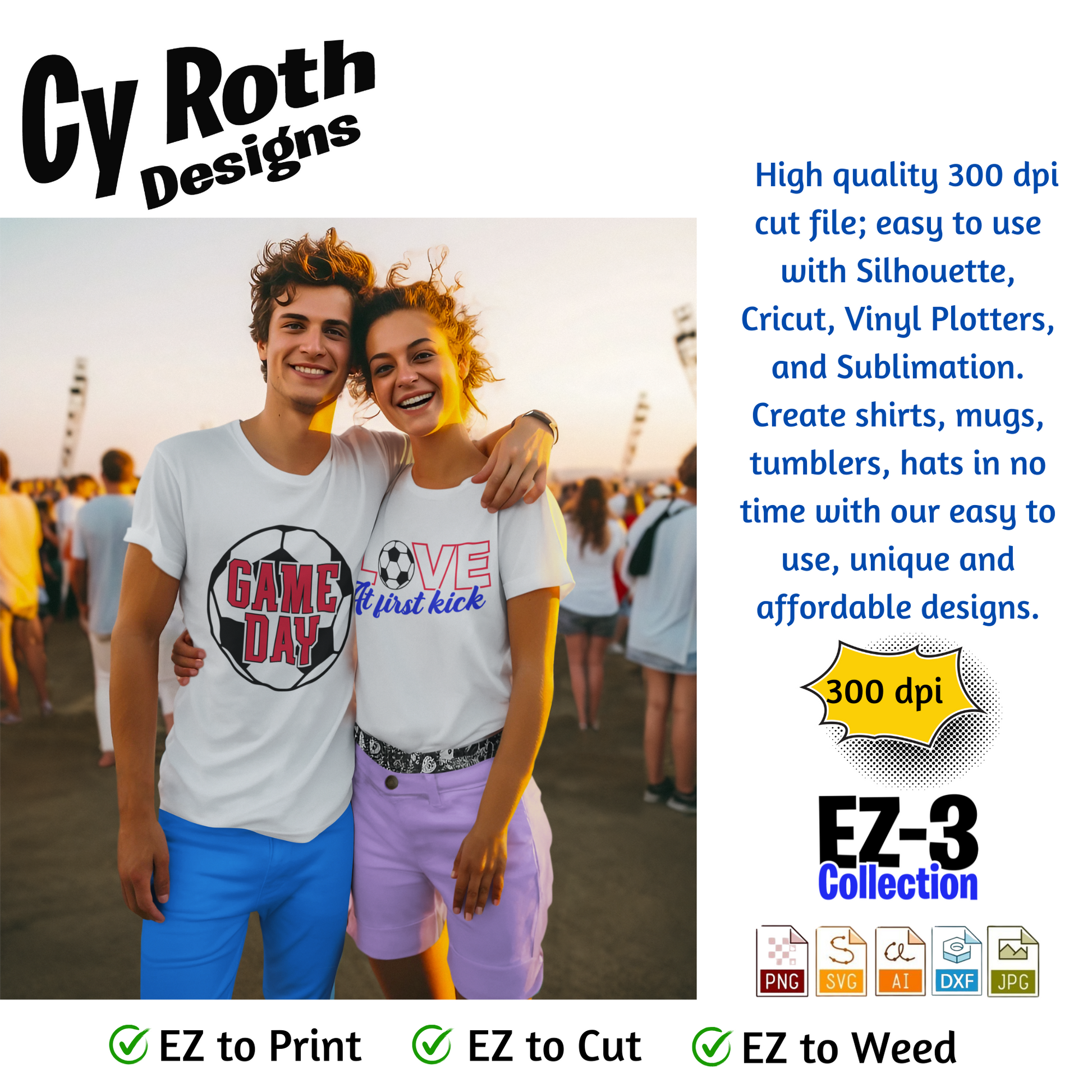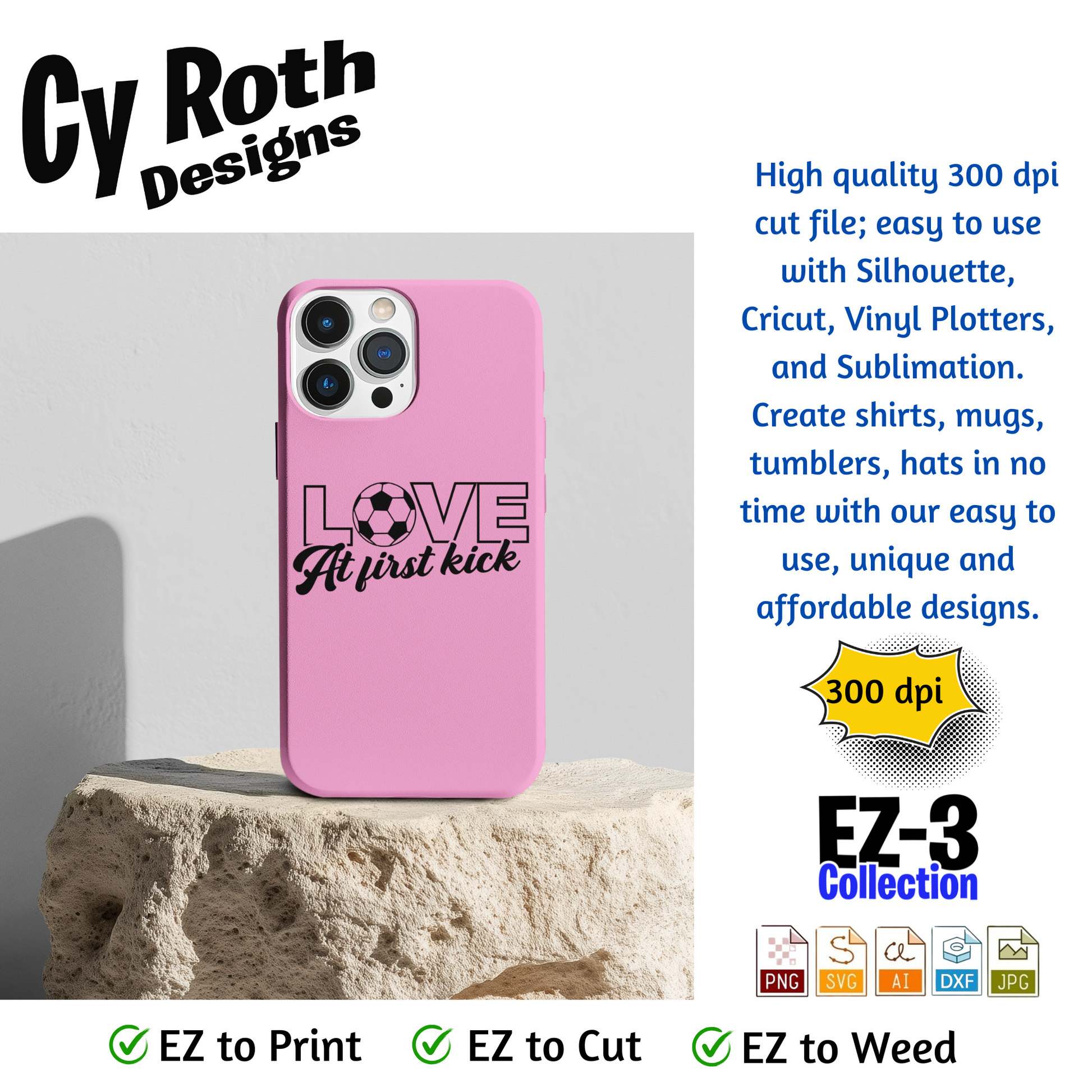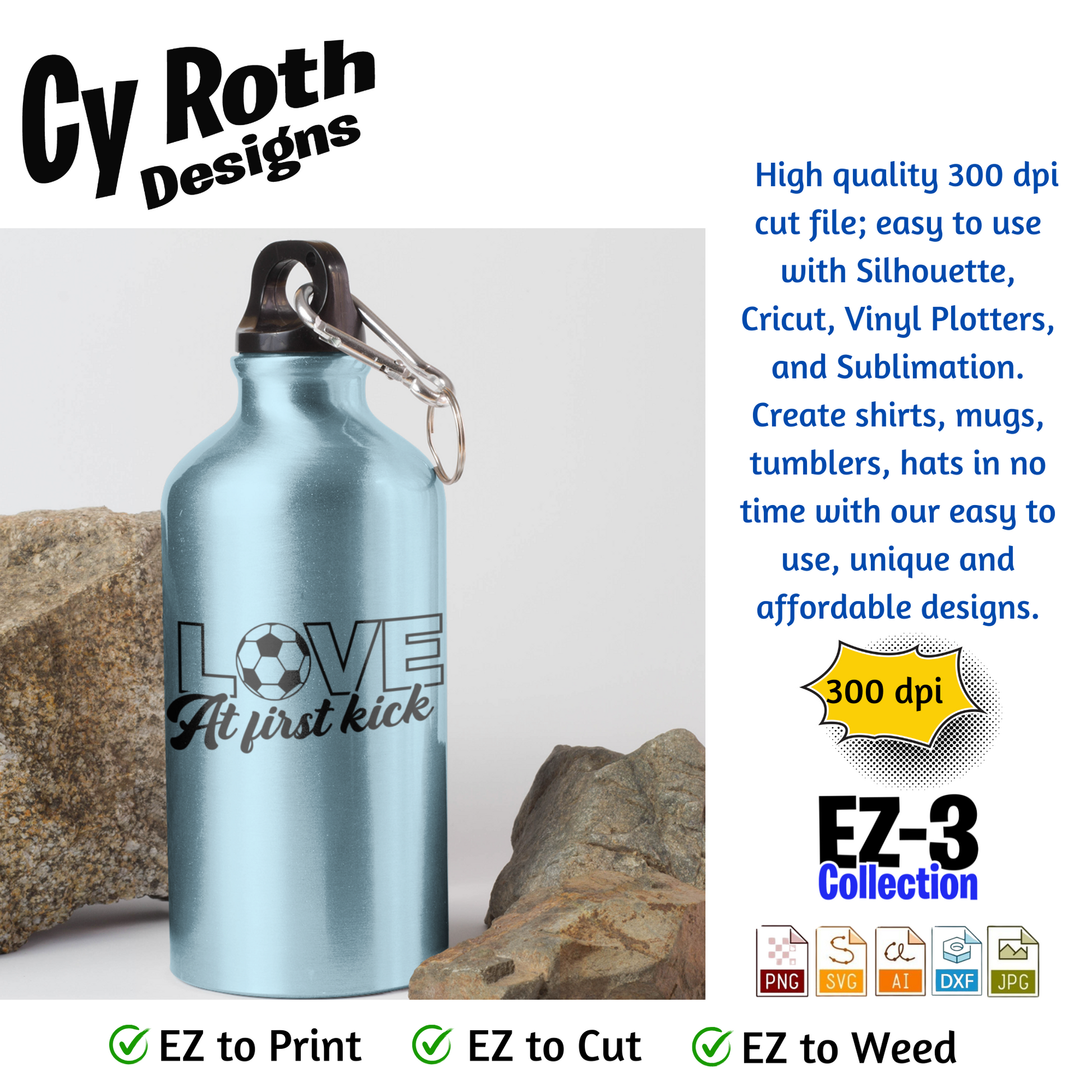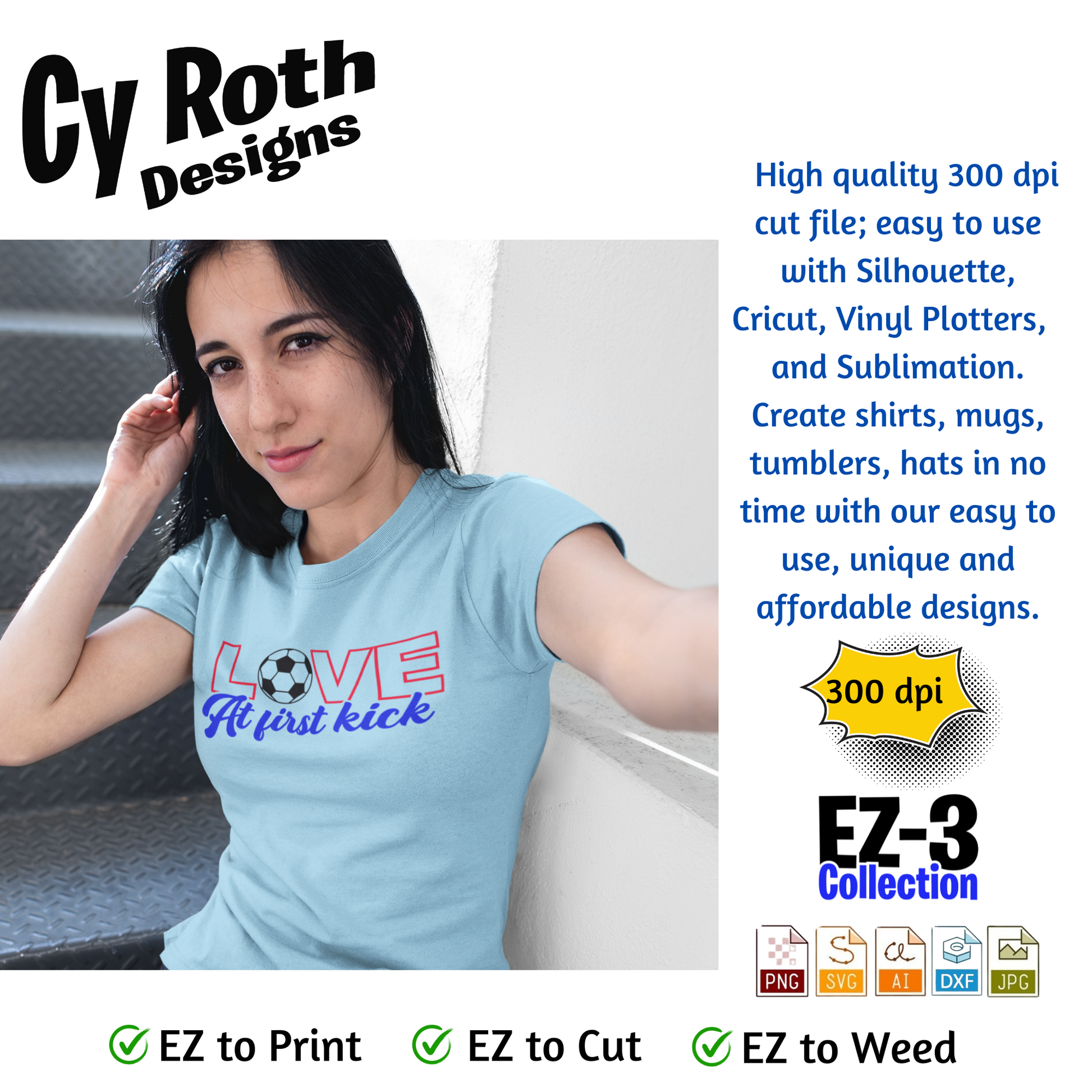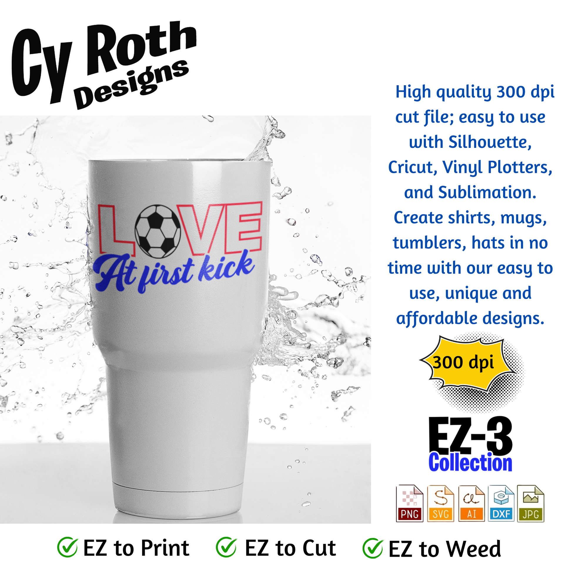 Soccer svg png jpg ai dxf file, for Silhouette, Cricut, Vinyl Plotters, Laser, CNC and Sublimation. Great for DTF and DTG. Love at first kick.