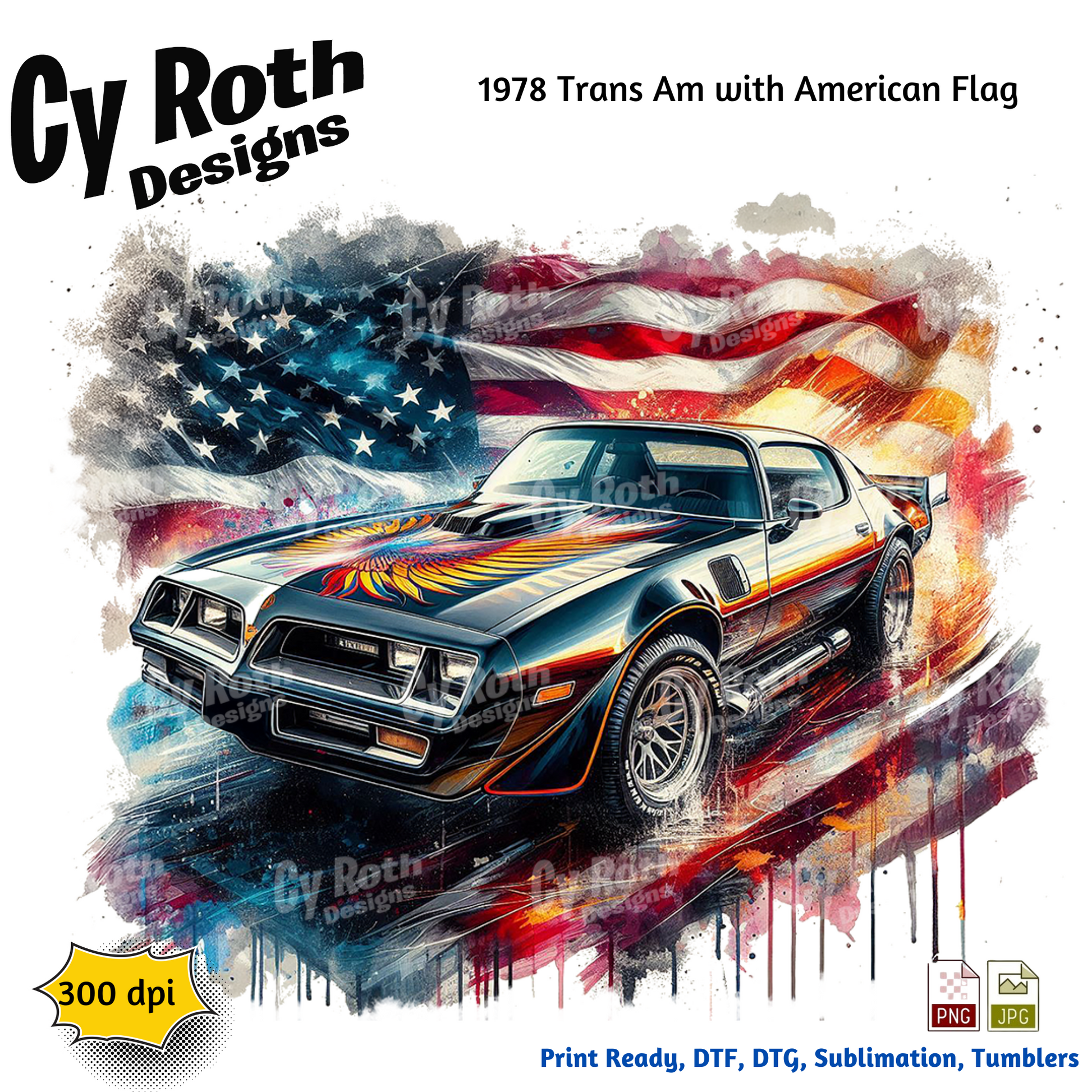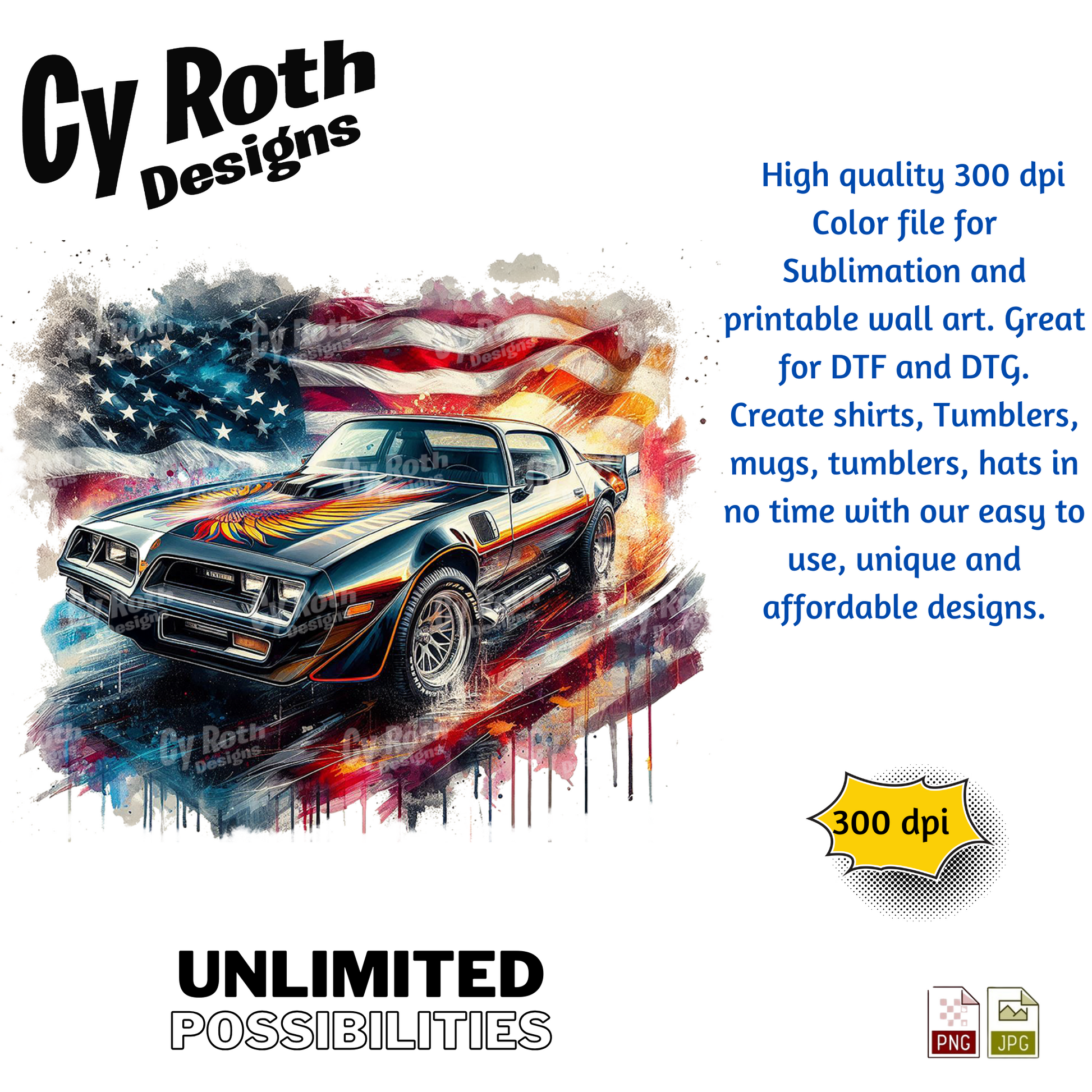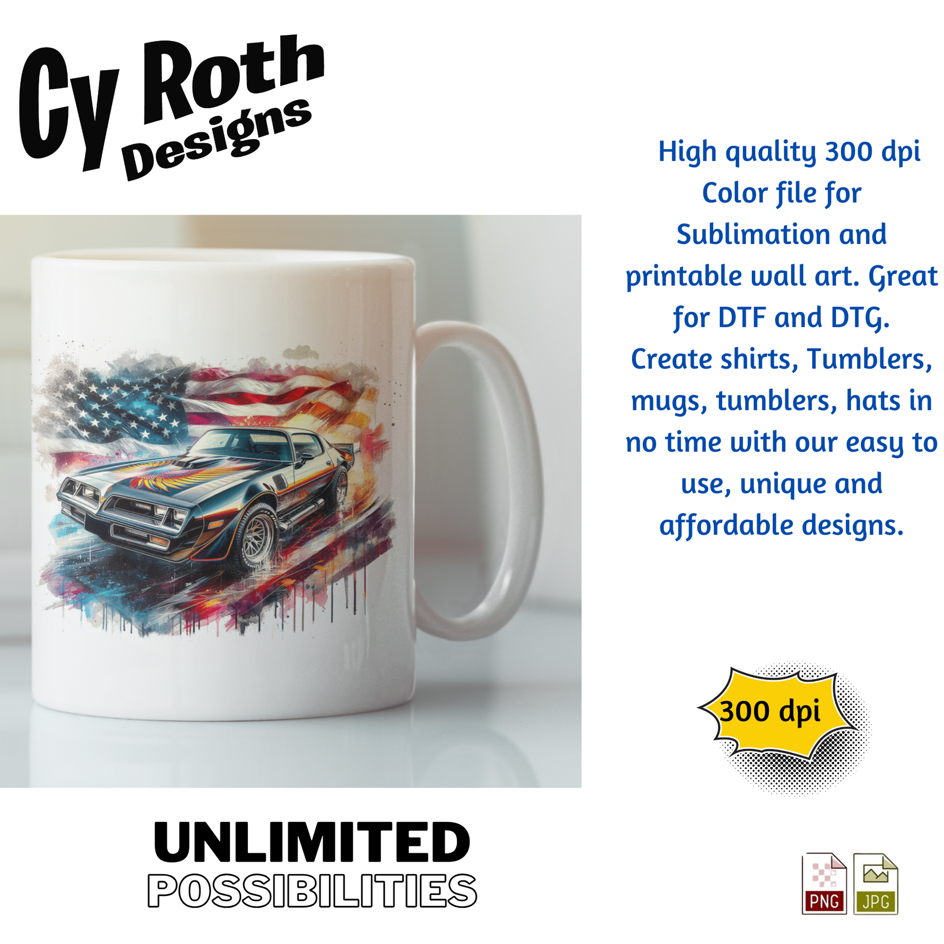 1978 Pontiac Trans Am with American Flag sublimation file to make tumblers, t-Shirts, Printable Wall Art, Sweatshirts. Great to make personalized gifts. Popular junk journal image also.