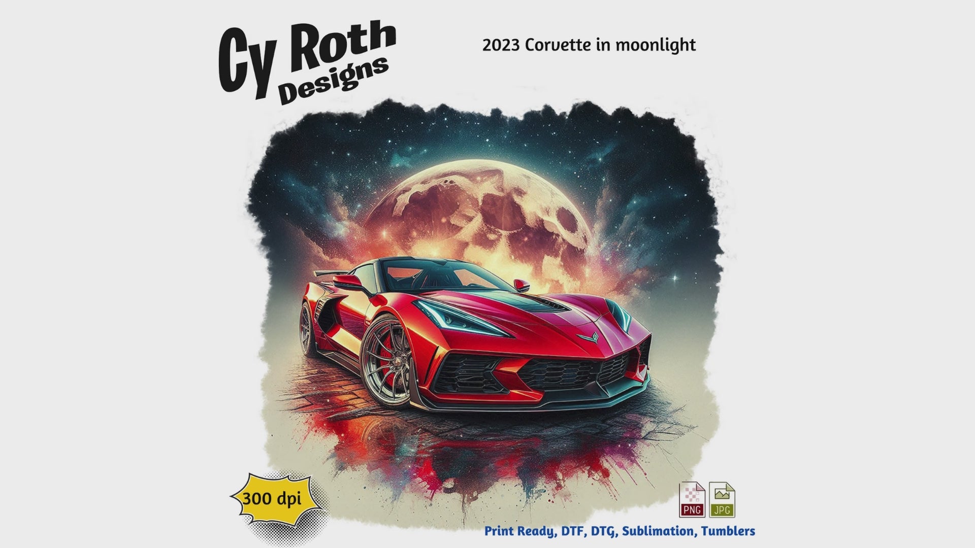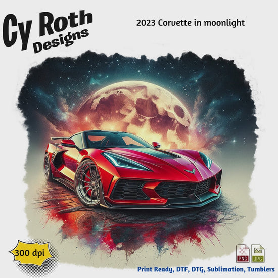 2023 Corvette in the moonlight sublimation file to make tumblers, t-Shirts, Printable Wall Art, Sweatshirts. Great to make personalized gifts. Popular junk journal image also.